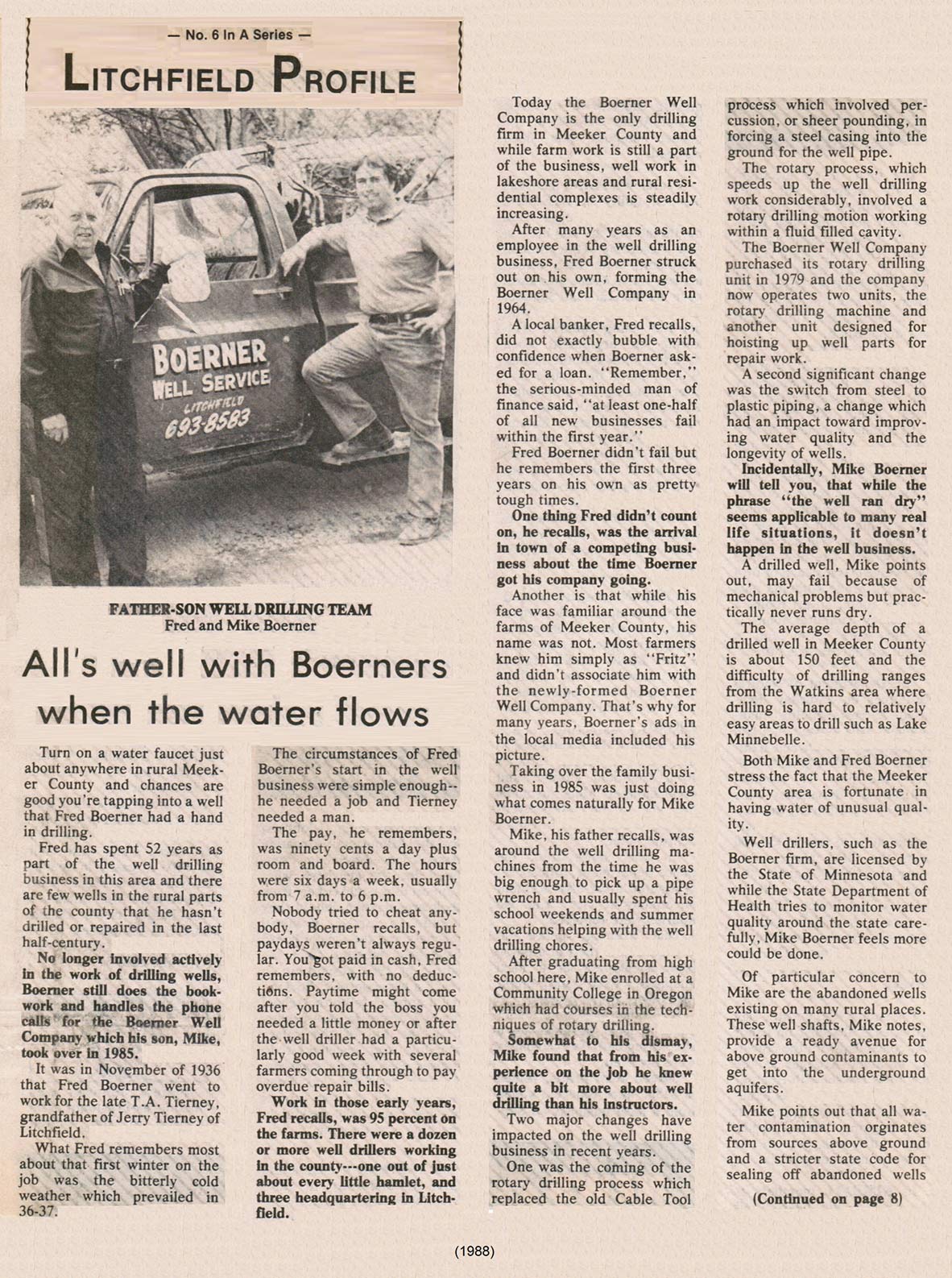 Fred opened his own business in 1964. His son, Michael often worked with him, from the time he was big enough to pick up a pipe wrench. In 1985, Fred sold the business to Michael but kept doing the bookwork until he passed in 1994. Now Boerner Well Co. is run by Michael and his wife Debra.
